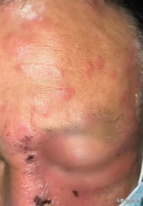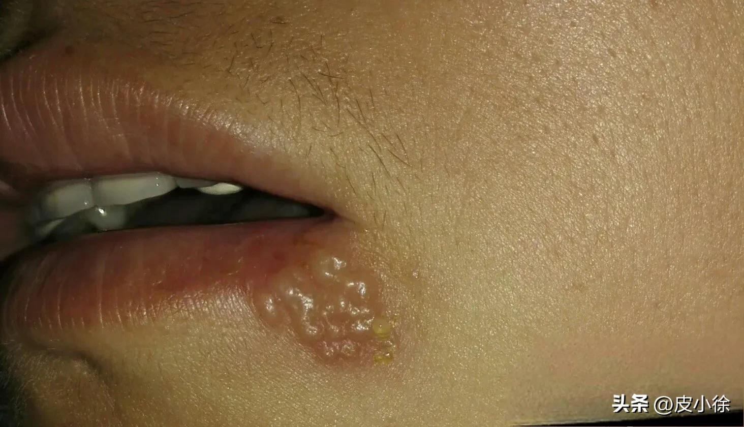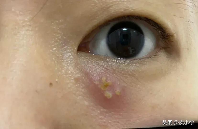 Herpes viruses are divided into two categories. One is called Herpes Simplex Virus (HSV), commonly referred to as "internal heat" (shanghuo) resulting in cold sores on the mouth (Figure 2). This is primarily caused by Herpes Simplex Virus Type 1 (HSV-1) infection and usually self-resolves within about a week after onset. However, this virus remains latent in the nerve roots; when triggered by future overexertion, staying up late, alcohol abuse, or high stress, it can be reactivated, leading to a recurrence of herpes simplex. It is characterized by a cluster of small vesicles on an erythematous base. Of course, herpes simplex does not only occur around the mouth; it can also appear on other parts of the body, such as around the eyes (Figure 3). If this is the first onset, it may be caused by someone with herpes simplex kissing that area or through indirect contact with the herpes simplex virus. While unboxing express packages could potentially lead to periocular herpes simplex, I believe the probability is relatively low.