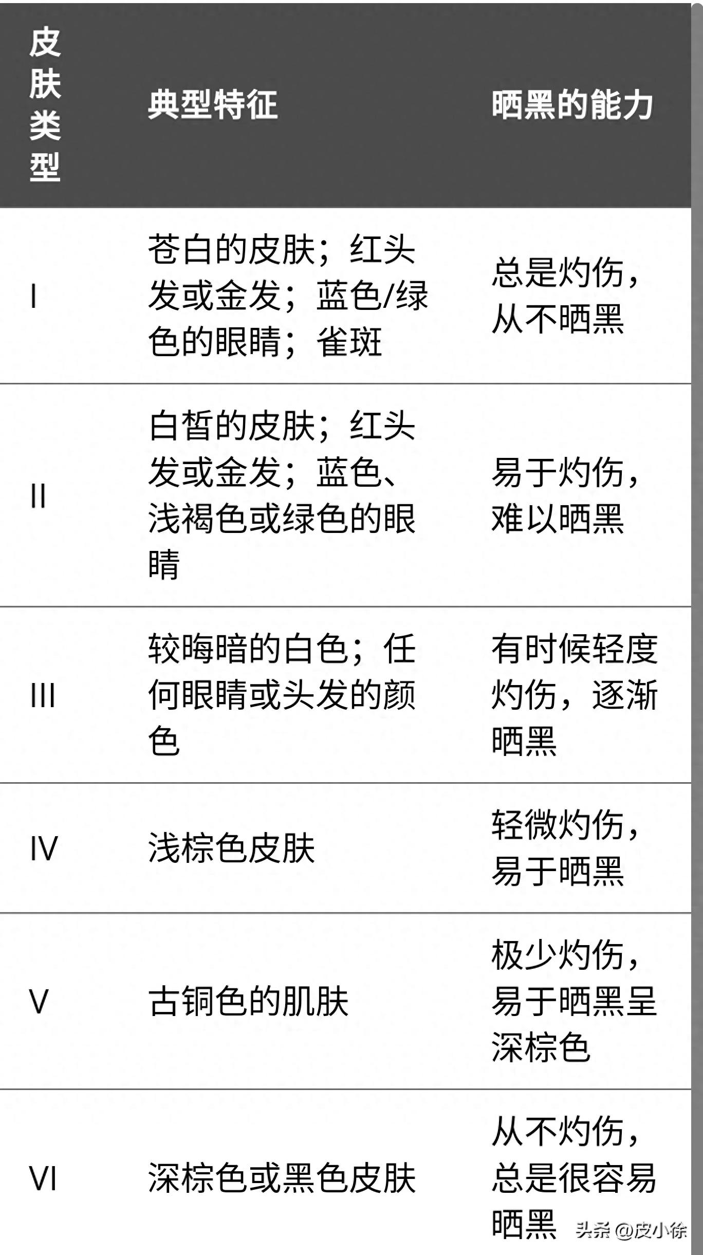 Human skin can be classified into six types, as shown in the table below: individuals with fairer skin (Type I) are more prone to sunburn but less likely to tan, whereas those with darker skin (Type VI) are less prone to sunburn but tan very easily. This serves as a reminder that individuals with darker skin tones need to be more vigilant about the risk of tanning.