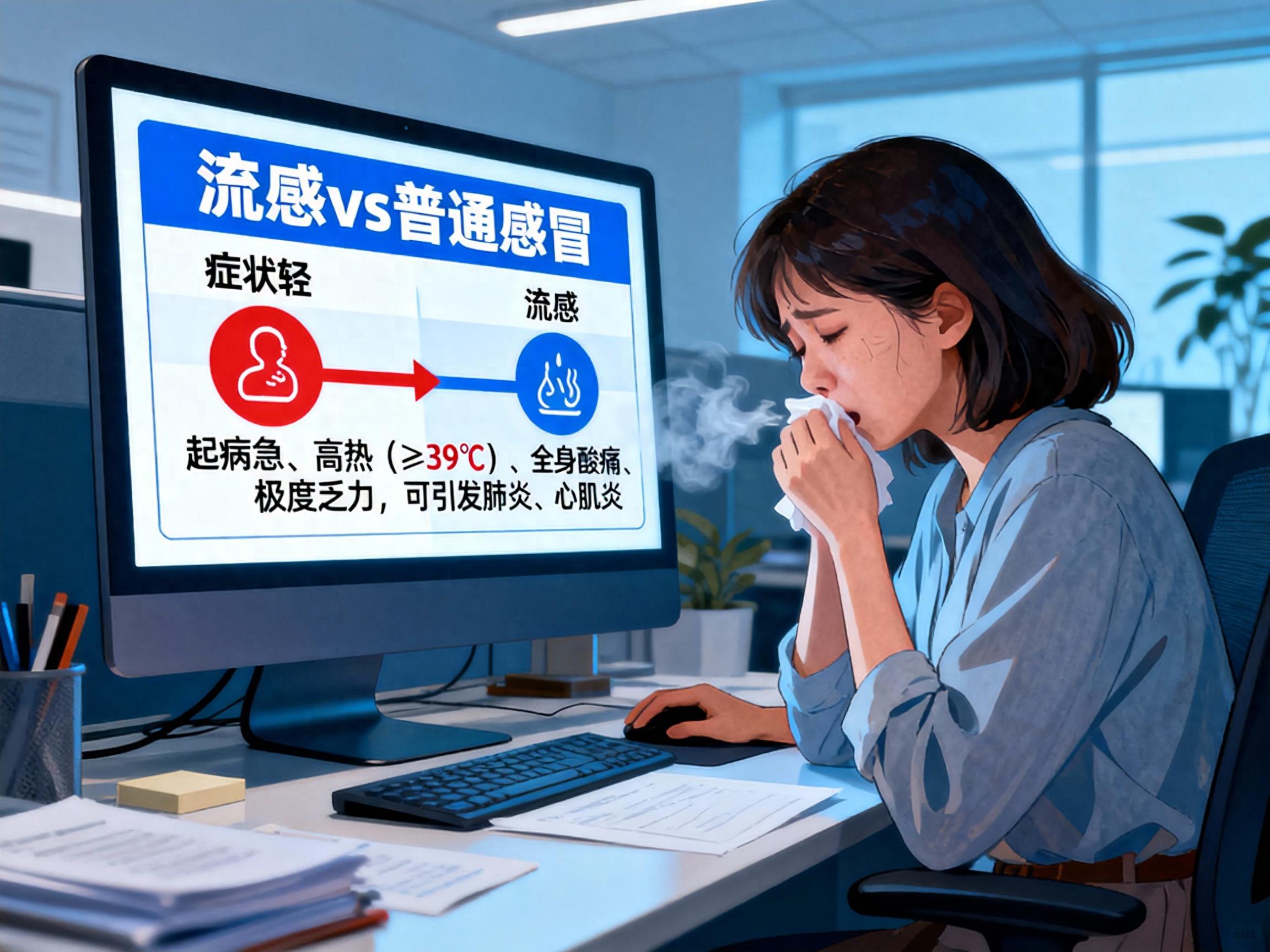 Looking back now, how ridiculous that self-doctoring was. Influenza viruses and common cold viruses are completely different: the common cold has milder symptoms, whereas influenza has a sudden onset, often accompanied by fever above 39℃, generalized muscle aches and extreme fatigue, and can lead to serious complications such as pneumonia and myocarditis.