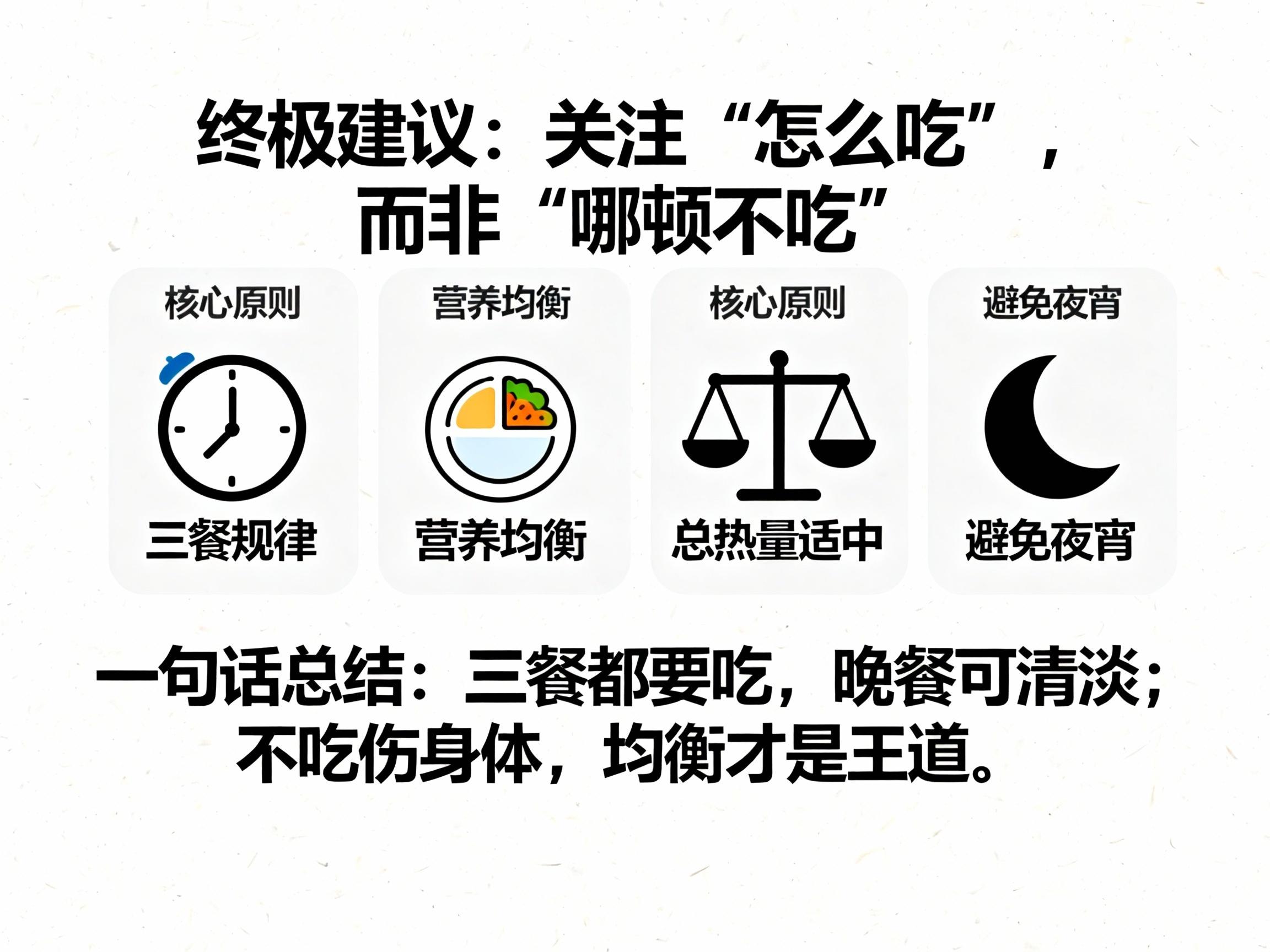 First, one core principle must be made clear: eating three meals regularly is more important than deliberately omitting a particular meal.