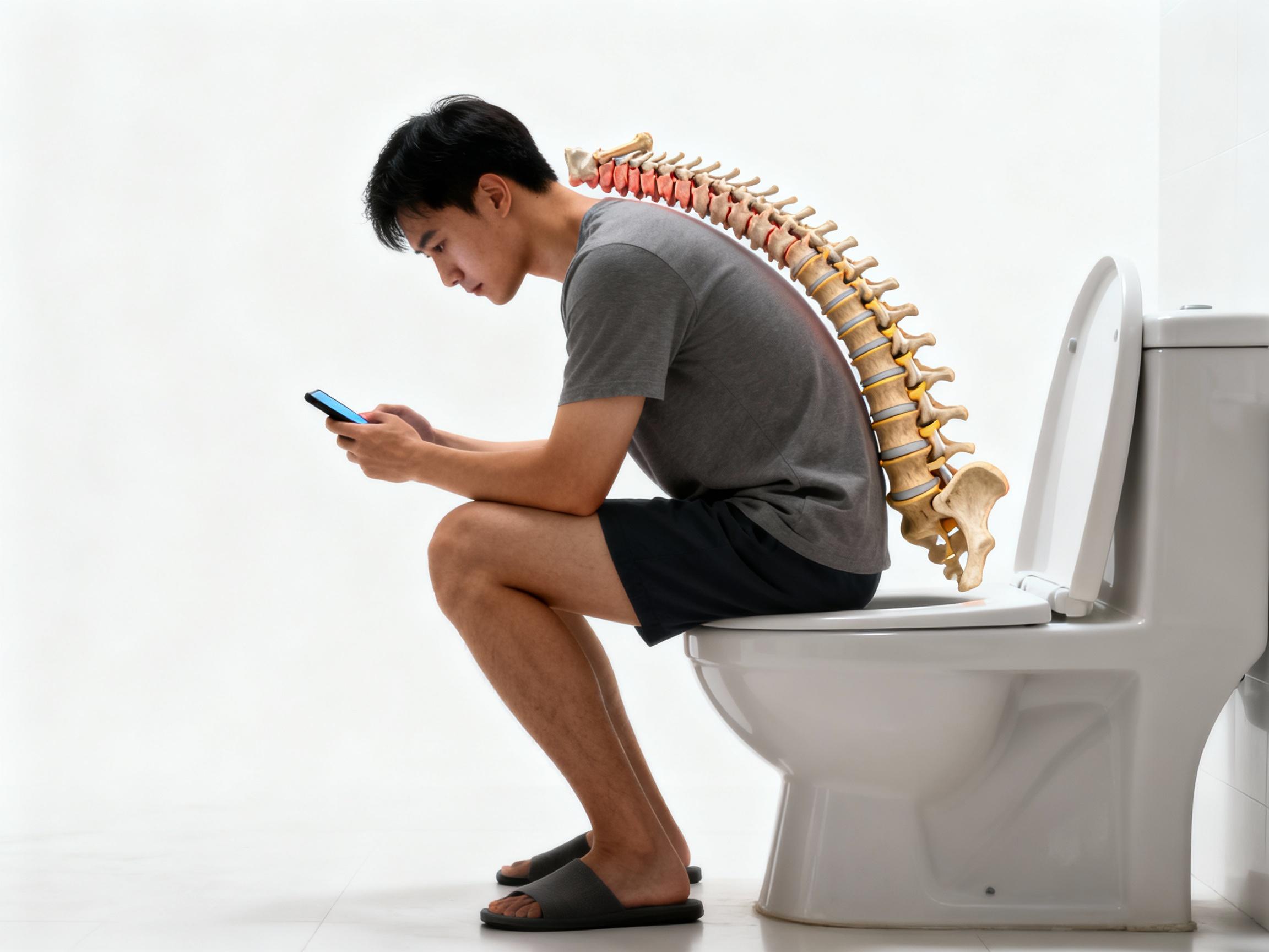 Especially with squatting toilets, the lumbar spine lacks sufficient support, altering its natural curvature and increasing the gravitational load on the intervertebral discs; over time this can induce lumbar disc herniation. Playing with a phone while on the toilet causes the body to unconsciously lean forward, multiplying the pressure on the cervical spine.