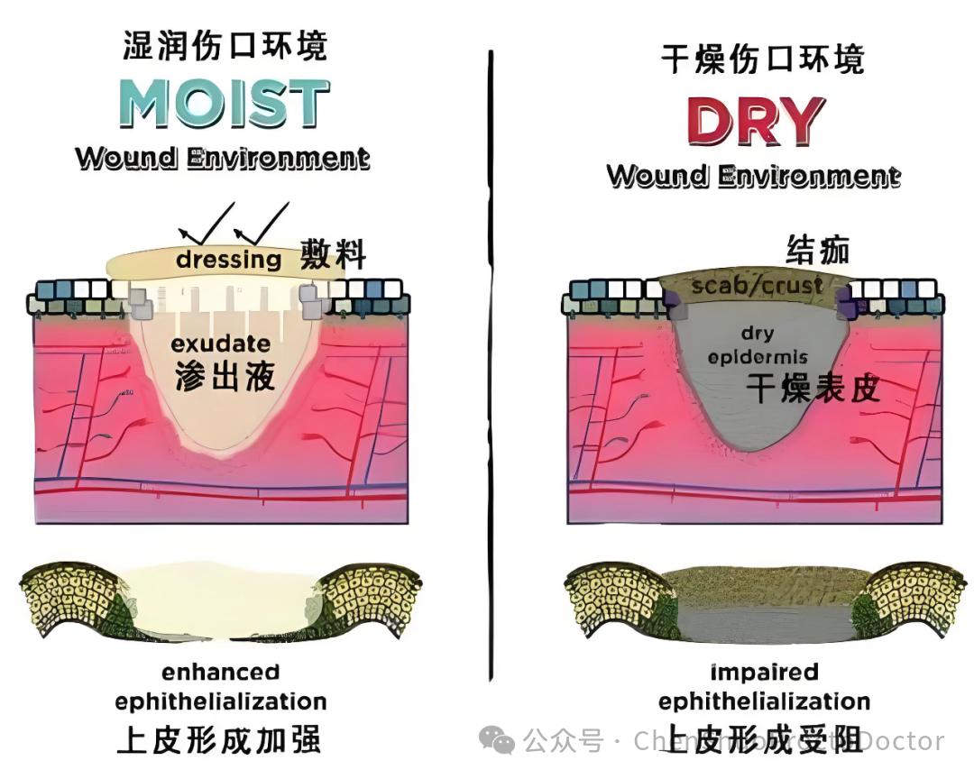 A dry wound is prone to dehydration and scabbing, which acts like "building a wall" for new epithelial cells, hindering their migration and repair;