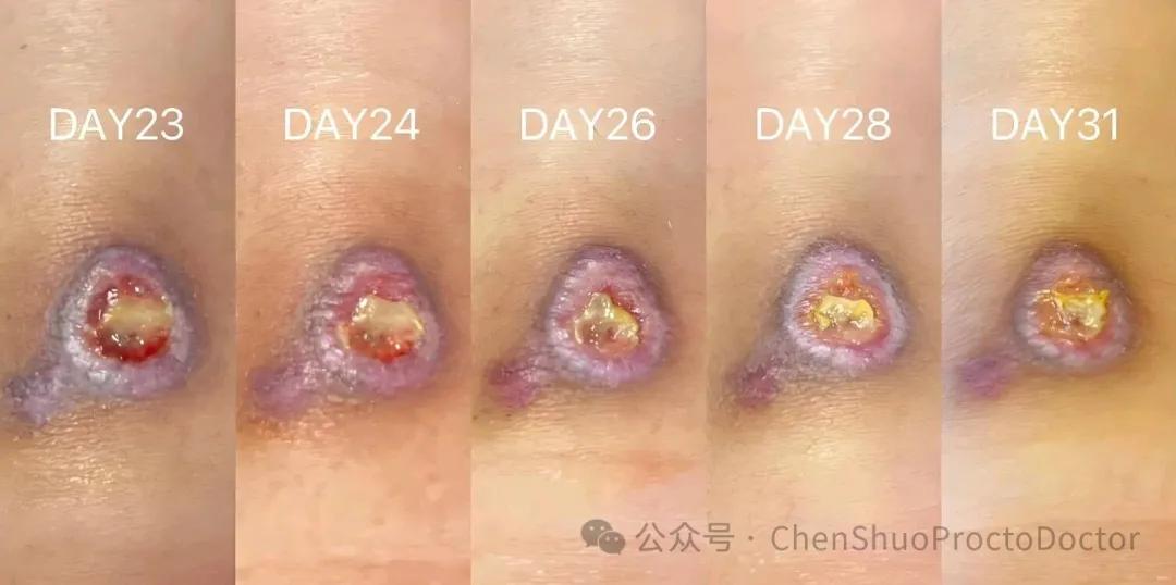 The "secondary healing" shown in the image often aligns with the type of open wounds seen in anorectal surgery.