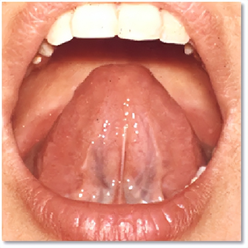 Normal Tongue Vein: Length does not exceed three-fifths of the distance from the sublingual caruncle to the tongue tip, with a pale purple color