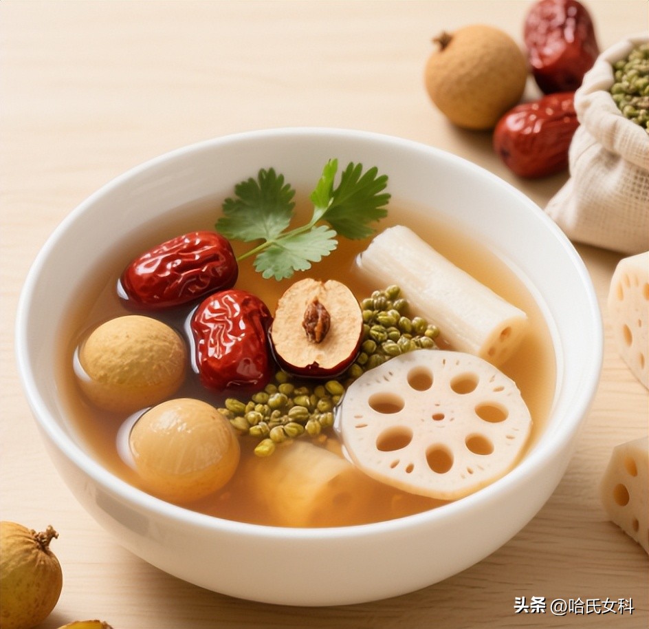 Wash and shell 10 longan fruits (keep the shells), wash and tear 6 jujubes, and prepare 3 lotus root joints. Add one beer bottle cap of sophora japonica buds. Combine all four ingredients with 2500ml of water, bring to a boil, then simmer over medium or low heat for 25 minutes.
